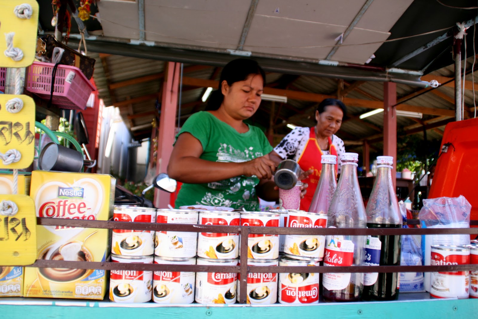 Certainly the highlight of this hodgepodge meal was the fried chicken.  “Meena’s Fried Chicken”, as advertised on the side of the rickshaw cart, employed four people, all with specific duties.  There was the fryer, who scooped out chicken cuts from a nearby cooler by the armful to dredge in batter and fry in two large woks, filled with green onion and chili.  There was the hacker, who, once the chicken was out of its hot oil bath, took a cleaver to the steaming hot cuts of chicken and with a few solid swoops, hacked each fried hunk of fried goodness into perfect little finger-licking pieces.  This hacker would also, between batches of chicken, pack up little bags of sweet-sour-spicy dipping sauce and tie them with a rubber band, all in one fluid motion.  There was the packer, who would take the cuts of chicken that you threw at her (indicating that Yes, these are the ones that I want) and pack them in a clear plastic doggy bag lined with paper, along with the sweet-sour-spicy dipping sauce, calculating the amount due as she went.  Then of course there was Meena herself, overseeing the process and counting money.