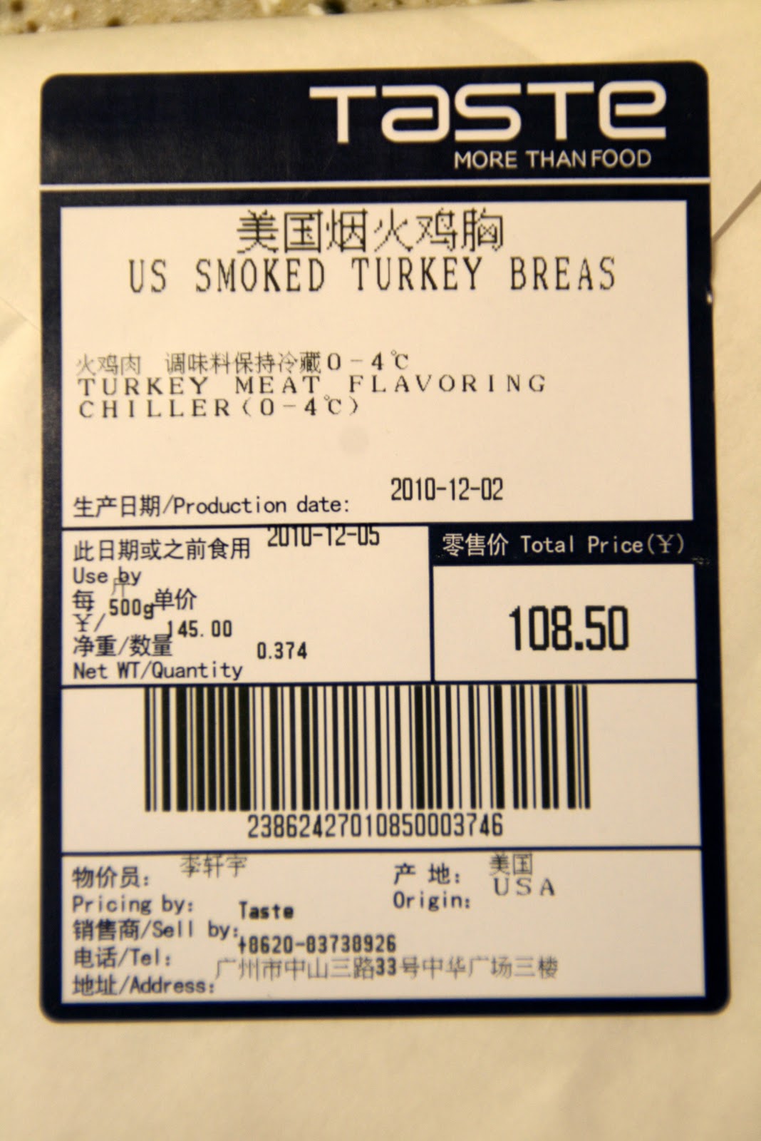 I snapped this pic of the deli label from one of our purchases a month or so ago. I wanted to prove that I wasn’t exaggerating whenever I claim that “Western” food here comes with a price. Exhibit A: Roasted deli turkey breast goes for 145RMB/500g, which is about $22/pound.